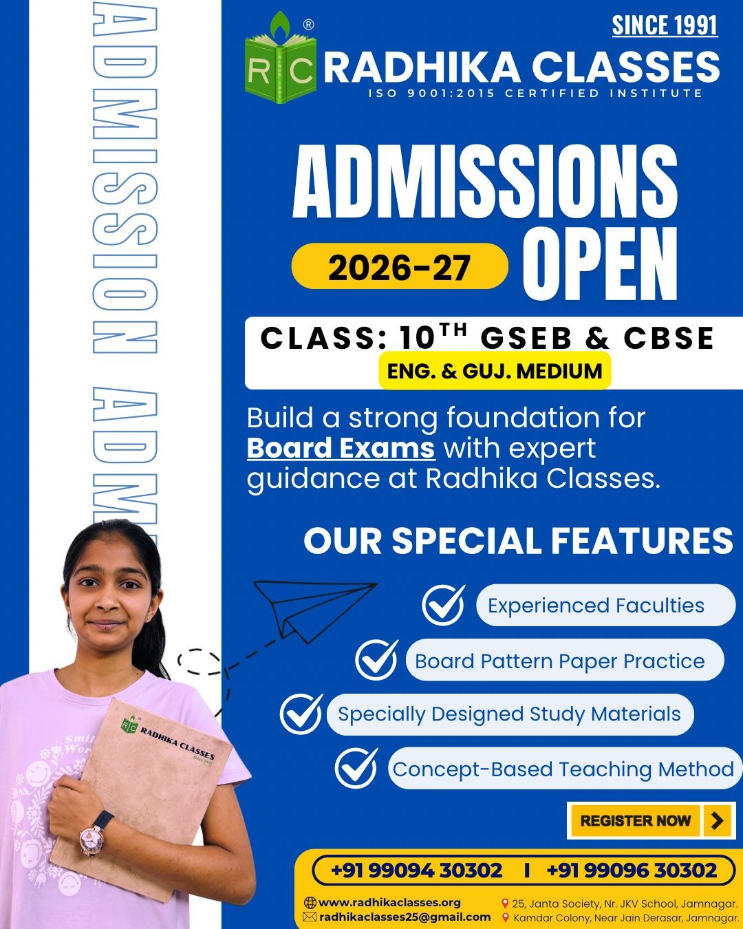 25, Janta Society, Opp. Jekurben Soni Kanya Vidyalaya, Jamnagar - 361 006 E-Mail : radhikaclasses25@gmail.com Call us : +91 99094 30302 |